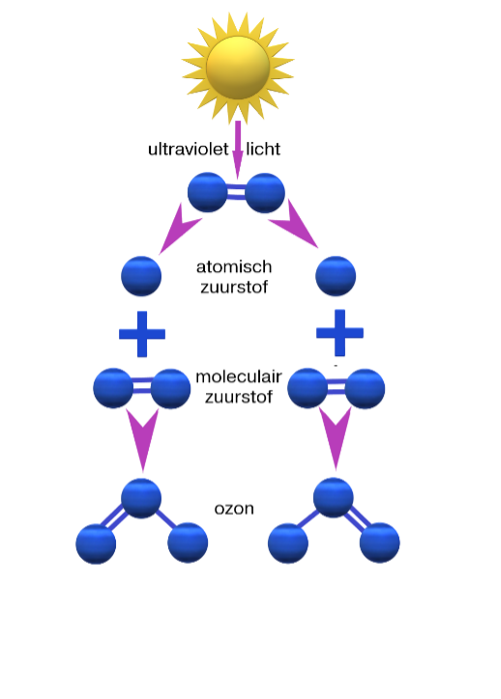 Net zoals in de dampkring wordt onder invloed van ultraviolet licht of elektrische ontladingen zuurstof (O2) in ozon (O3) omgezet (zie afbeelding links).